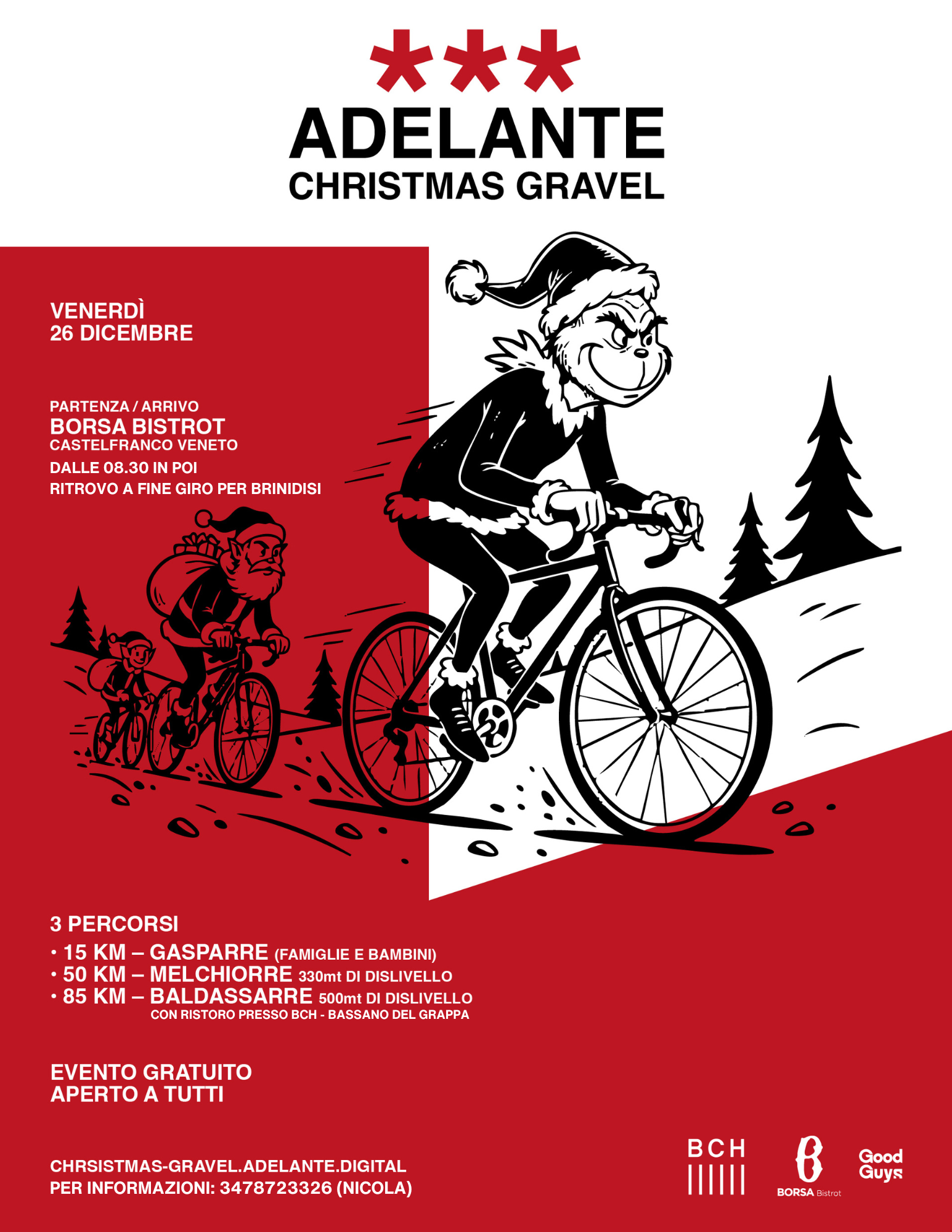 🎄🚴‍♂️ Santo Stefano su due ruote: Adelante Christmas Gravel — venerdì 26 dicembre, partenza/arrivo Borsa Bistrot, Castelfranco Veneto (TV). Evento gratuito, aperto a tutti: famiglie, gravel & MTB.🤶🏼